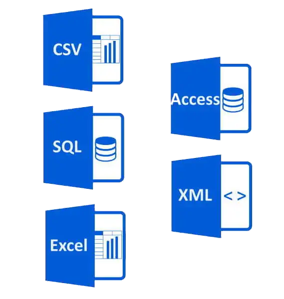 CSV, EXCEL, SQL, Access, XML, Web API, Data Scraping