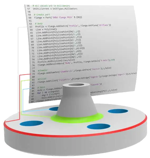 Eskiisi loomisest kuni tunnuste genereerimiseni saab elemente modelleerida koodis. Automatiseerige 100 detaili loomine CSV-andmeallikast või looge keerulisi võrrandipõhiseid visandeid või võrdlusgeomeetriat.